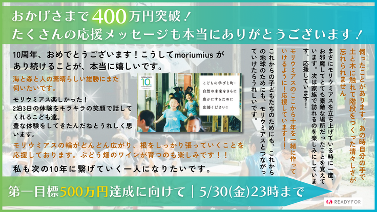 何としても第一目標500万円を達成し、モリウミアスの、こどもたちの、町の未来をつくるための活動を行っていたいと思っています。
