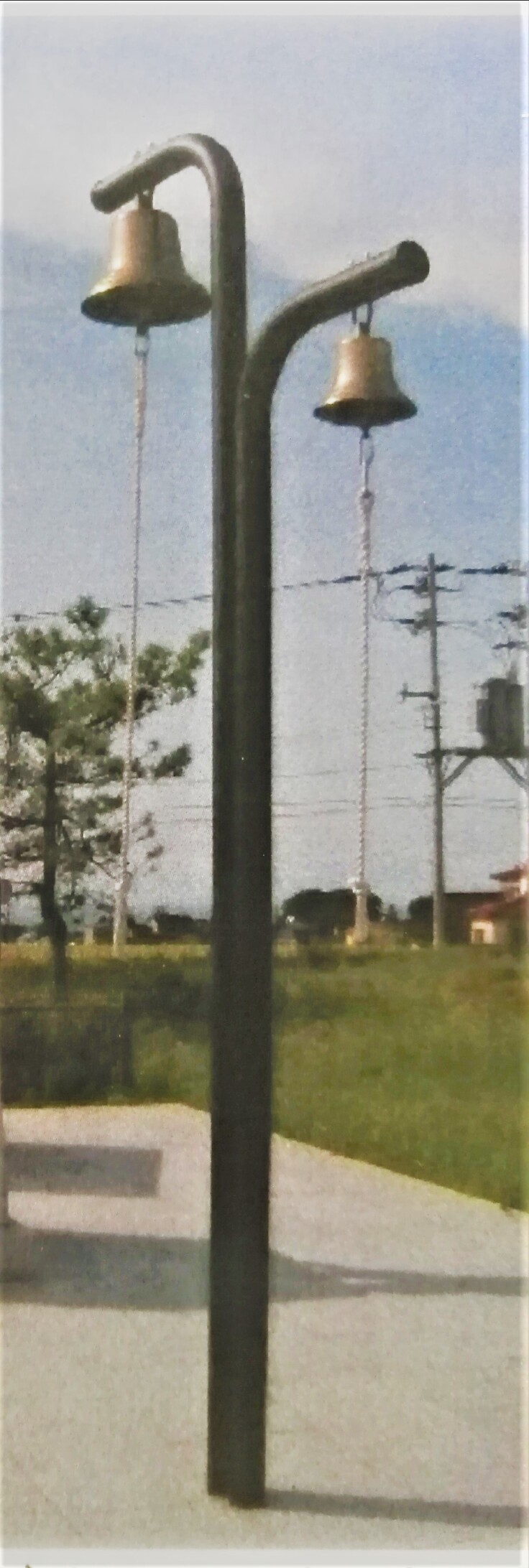 写真とは若干異なりますが、ベルの色はゴールド、ポールの色はシルバーになります。そしてポールには、「越中国守山城址」「平和のベル」と記されます。