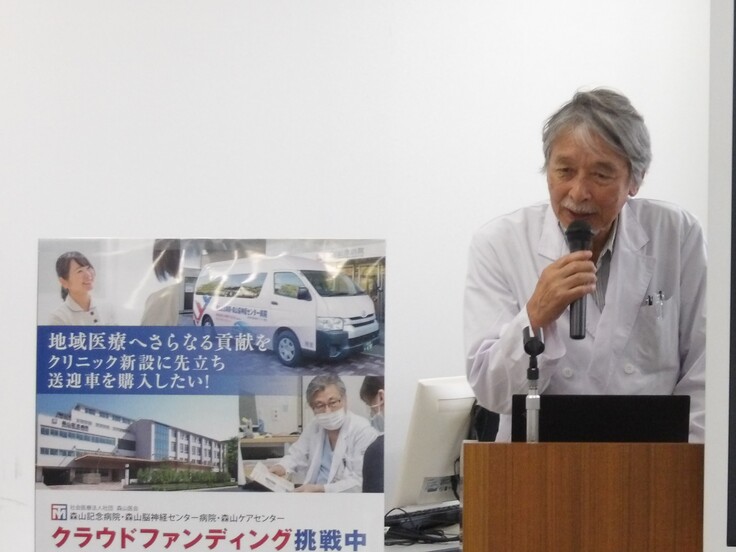主演台の横に「クラウドファンディング挑戦中」の看板が設置される中、森山記念病院の朝礼が開催されました。全職員がライブでの参加もできますし、院内システムで録画を閲覧することもできる仕組みです。
