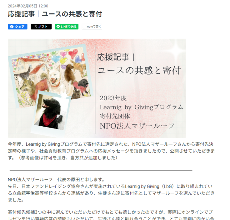嬉しい体験です。社会貢献教育プログラムで高校生の皆様から寄付先として選んでいただきました!