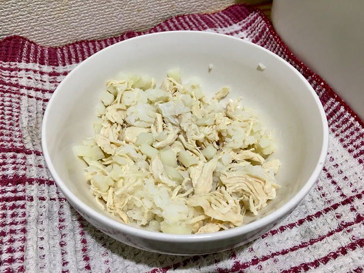 ピーチの場合は1日で白米50g、鶏のささみ75g、じゃがいも100g を一振りの塩で混ぜて食べさせます。