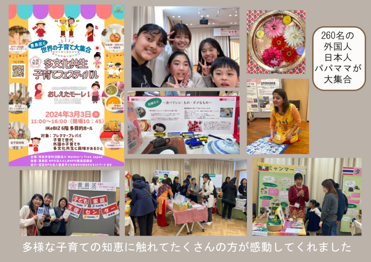 3月に行った多文化共生子育てフェスティバルには、260名の来場者があり、多くの日本人親子や妊婦さんが外国の子育ての知恵に感動してくださり、こうした活動に興味を持ってくださいました。また自治体や他の市区町村の関係者も来場され、たくさんの関係者と繋がることができました。