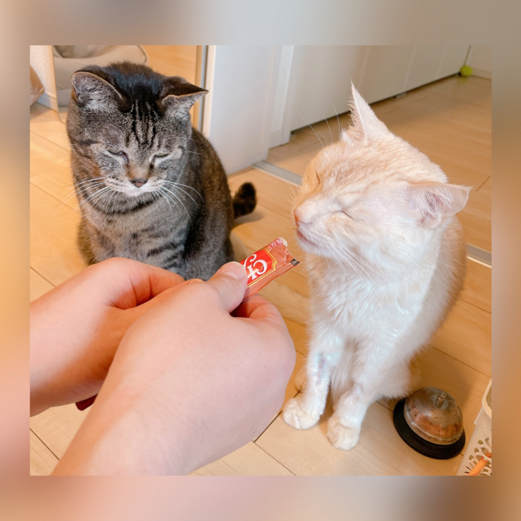 呼び出しベルを鳴らすのでチュールをあげると、「これじゃない😐」という顔をするので、てんやわんやしました💦色々試していると、くぅちゃん、以前はそんなに興味を示さなかった鰹節が最近大好きになったようで、鰹節をあげると満足そうに食べてくれました😋