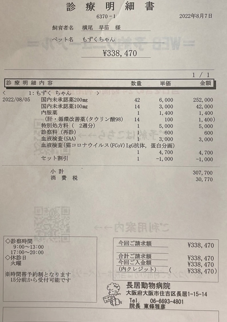 精密検査の結果が出るのが2022年7月2日と言われましたが、1分1秒を争うと思い、FIPの治療実績のある病院を探し診察予約をしました。