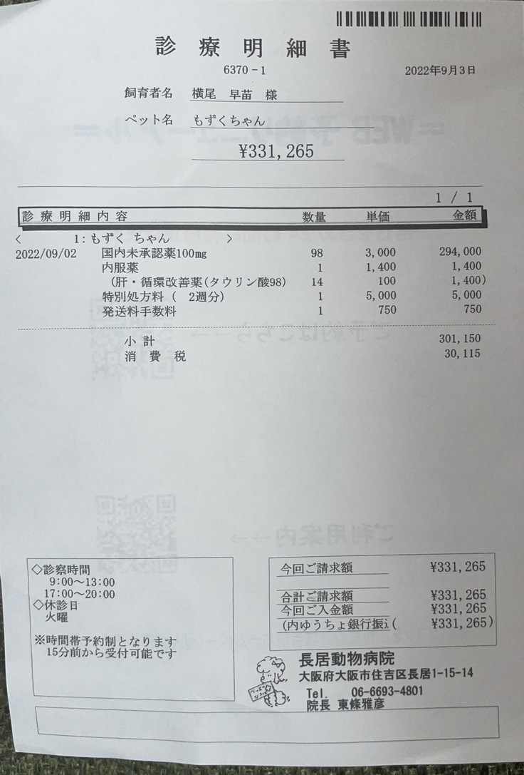 でも家族と涙ながらに何度も話し合い、もんちゃんのいない生活は何事にも耐えられない、もんちゃんが1日でも長く生きられるチャンスがあるのであれば、今できることをしてあげたいと考えて未承認薬の投与を決めました。