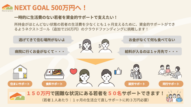 ネクストゴールでは、若者の生活を支えるための資金を整備していきます!