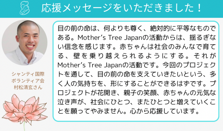プロジェクトが花開き、親子の笑顔、赤ちゃんの元気な泣き声が、社会にひとつ、またひとつと増えていくことを願ってやみません。心から応援しています。