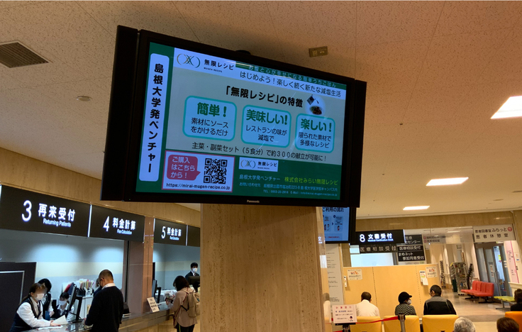 弊社は、島根大学認定のヘルスケアベンチャーとして、島根大学病院の全面支援を受けています。「無限レシピ」について、大待合室、各診療科でデジタルサイネージ広報、ポスター掲示およびリーフレット配布しています。