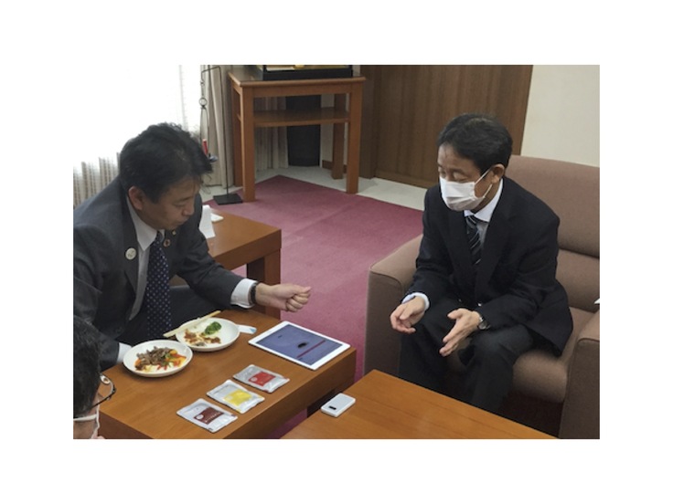 本日、飯塚俊之出雲市長に島根大学発ベンチャー(本店所在地は島根大学出雲・医学部キャンパス内)の設立を報告しました。献立アプリの試行と減塩食を試食していただきました。「とても減塩とは思えない、美味しい」とお言葉があり、本当に「完食」されて大きな自信となりました。