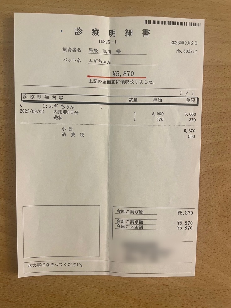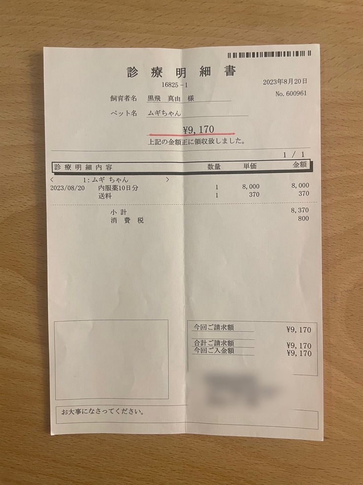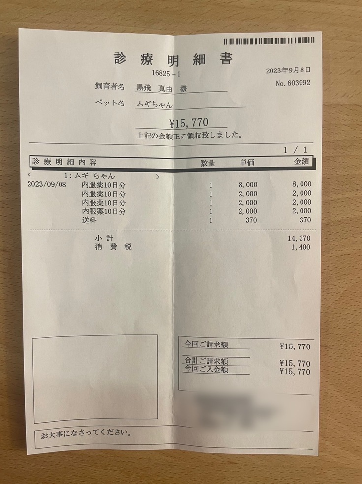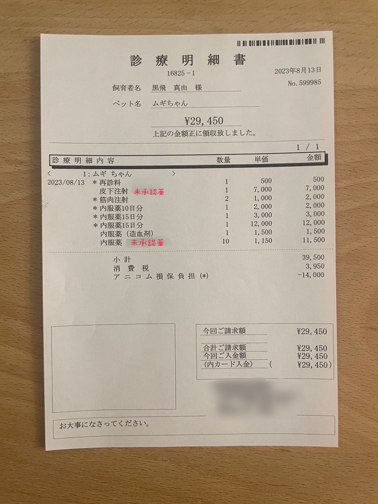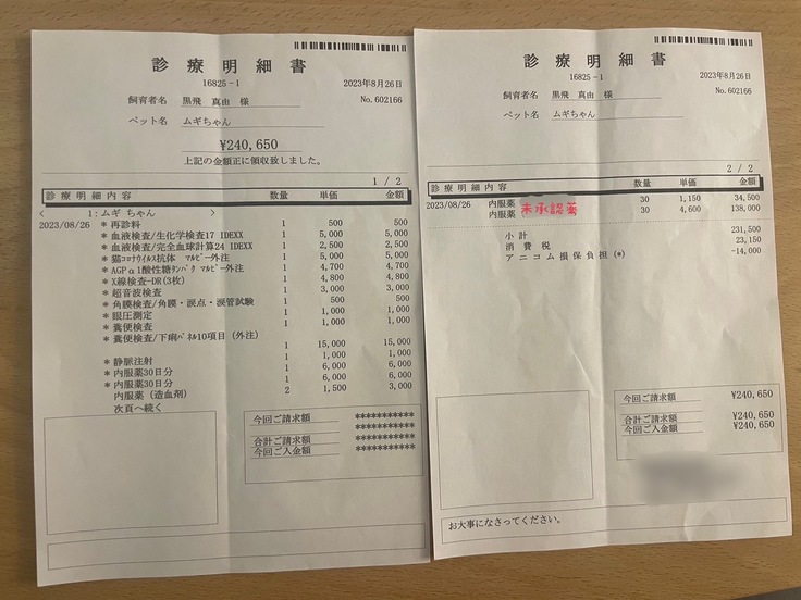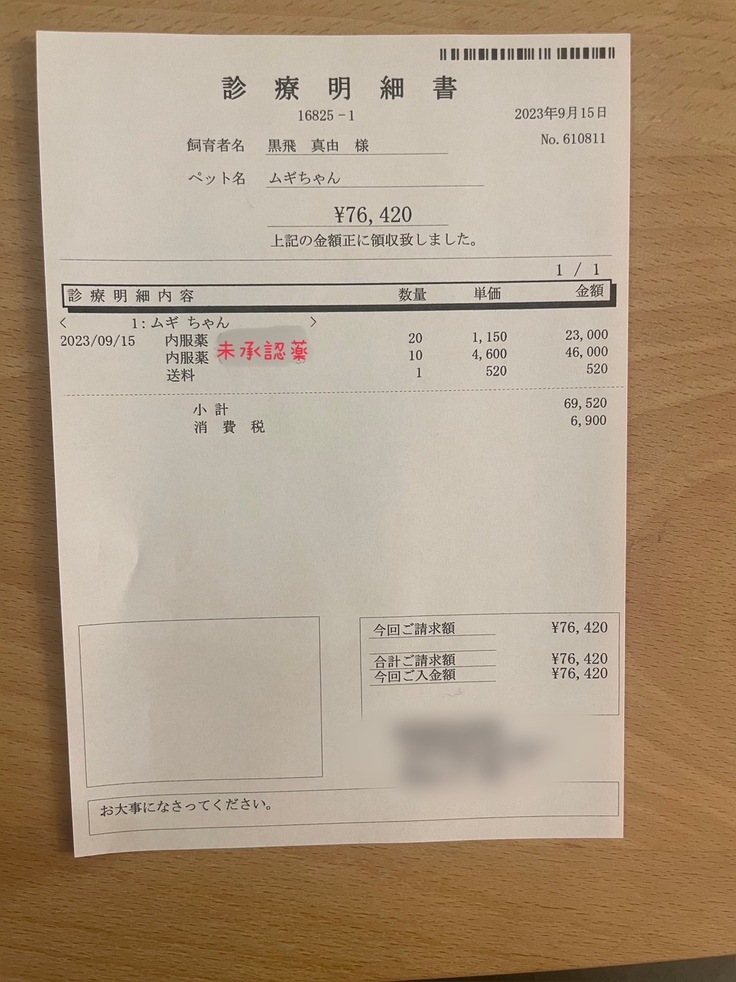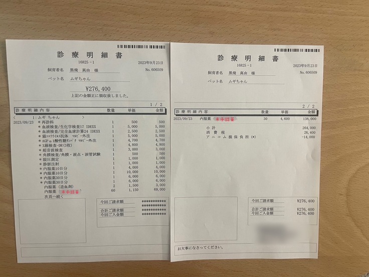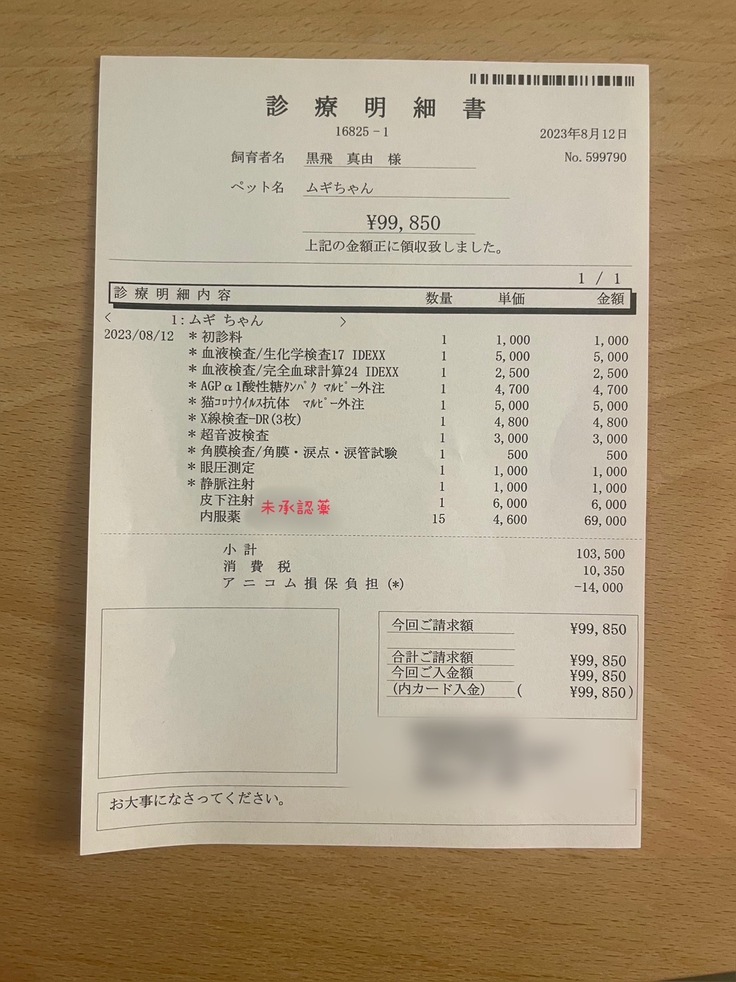 未承認薬開始位以前の治療費、1ヶ月の入院代、経過観察開始からの投薬などは自費といたしますためFIP治療期間のみの掲載といたしました。