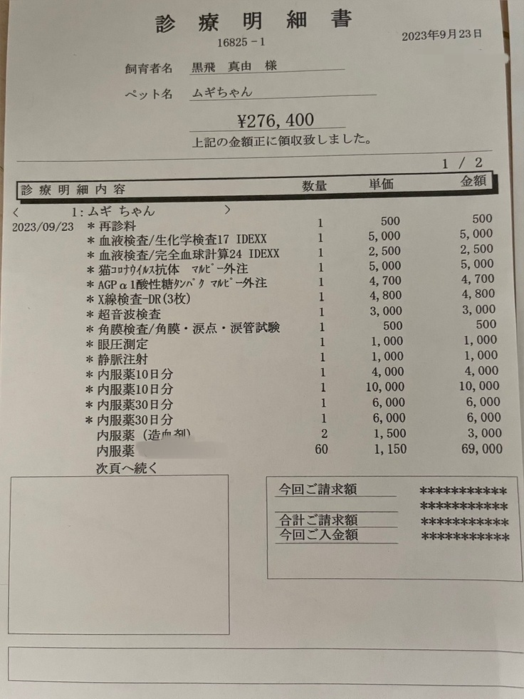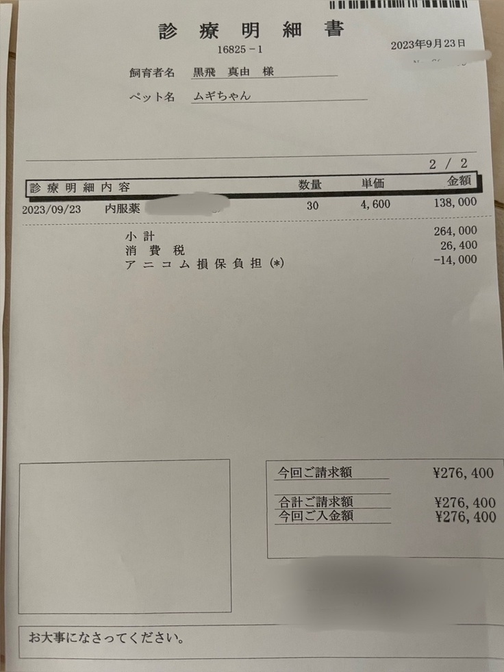 未承認薬がやはり一番の高額ですが、その他のお薬、検査代も膨大です。