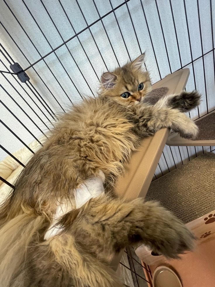 検査のために,しっかりと血液を採らないといけないのですが、まだ5ヶ月の子猫、さらに発育不全のむぎは血管もとっても細く、結果両足から採血となりこの包帯姿となりました。