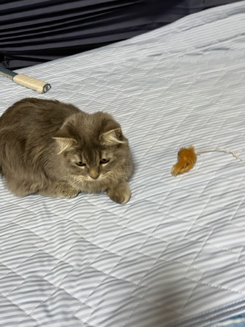 ▼ネズミのおもちゃで遊びたい飼い主とそういう気分じゃないむぎ😖