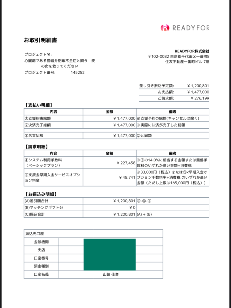READY FORよりご支援金が振り込まれました!