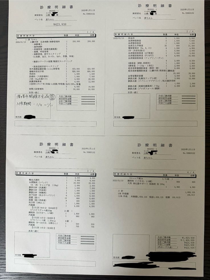 見積もり時には10日入院計算だったこと、麦の回復力がすごくて注射や点滴が少なかったこともあり、