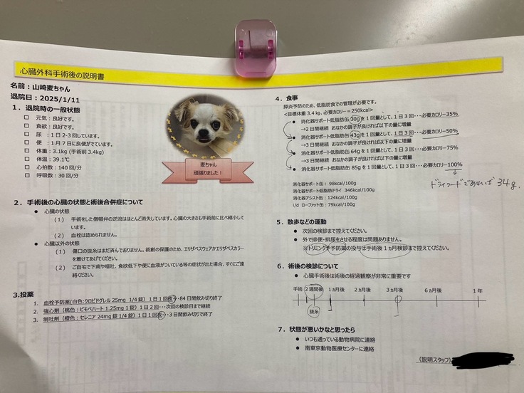 お薬は手術前から継続でピモベハート(強心剤)と血栓予防薬、そして最初の3日間だけ制吐剤が処方されました。