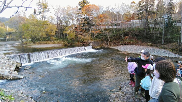 最後は、鵡川本流の落差工を見学しました。ここでは、落差工の魚道設置に深く関わった細谷誠さんと、占冠村で川育を行っている橋本陽さんにお話をしていただきました。この落差工の魚道は2年ほど前に魚道が設置されました。設置にあたっては、住民が集まってなぜ落差工が作られたのかというところから調べ、学び、考え、じっくりと話し合いが行われました。