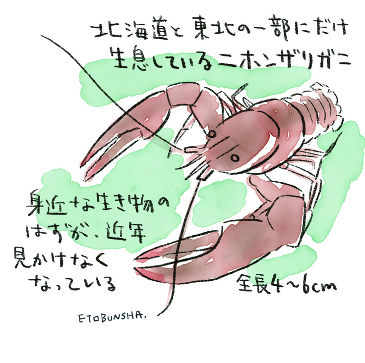 (「旅のムック本 旅人類8号」に掲載中の新岡さんのニホンザリガニイラスト)