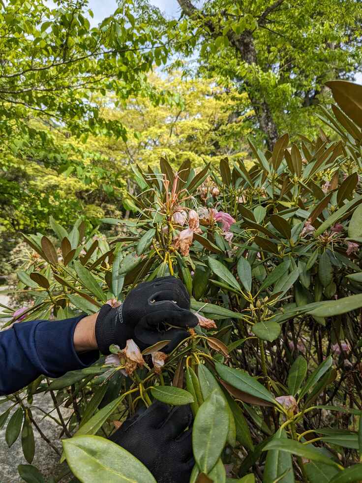 咲き終えた石楠花の花は、掃除の手間など考えて花摘みを行っていきます。