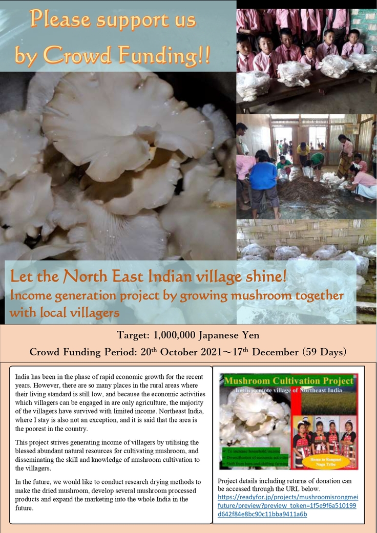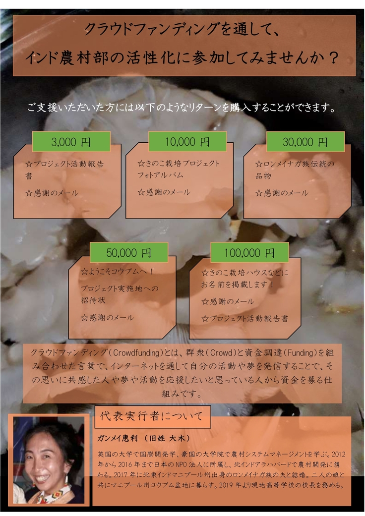 【インド北東部僻地に希望溢れる未来を。きのこ栽培で収入向上を目指す!】代表実行者のガンメイ恵利です。