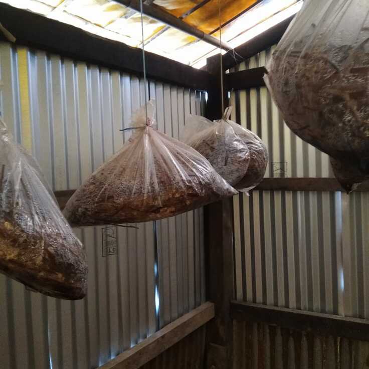 本来なら、稲藁を詰めた袋を棚に置くスタイルでしたが、ネズミの被害を受けて急遽、天井からつりさげるスタイルに変更しました。袋の中に白いものが見えるでしょうか。これがもっと広がっていくときのこが生えてくる前段階になります。