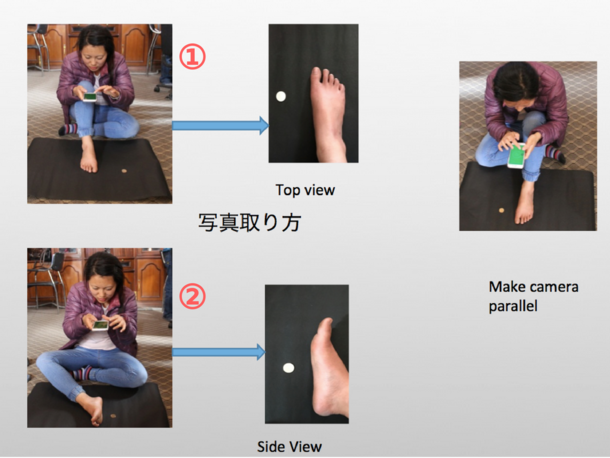 ②100円玉もしくは10円玉を足の横に置き、参考写真のように足を横に倒して真上から撮影して下さい。