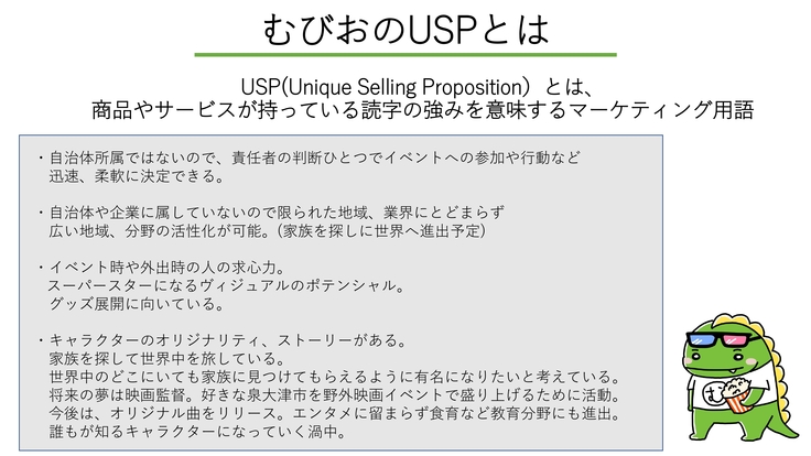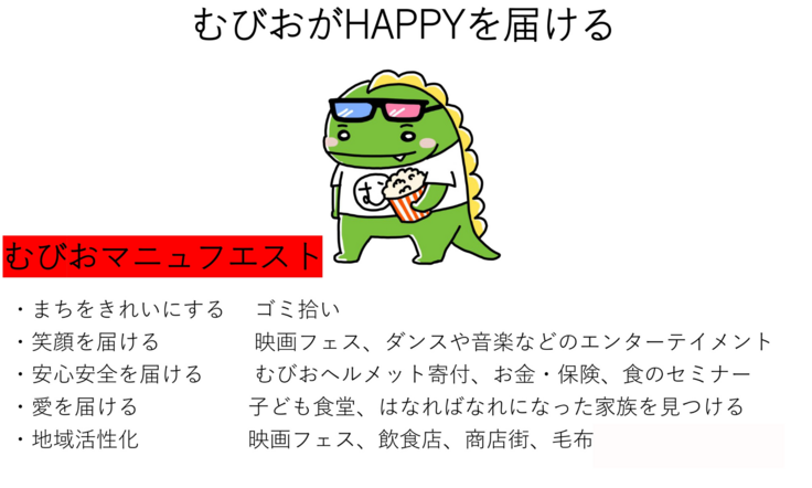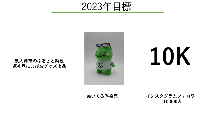 むびおが有名になることで、映画上映イベント「泉大津野外映画祭」の認知も向上し、集客やふるさと納税の返礼品など、さまざまな波及効果が生まれると考えています。