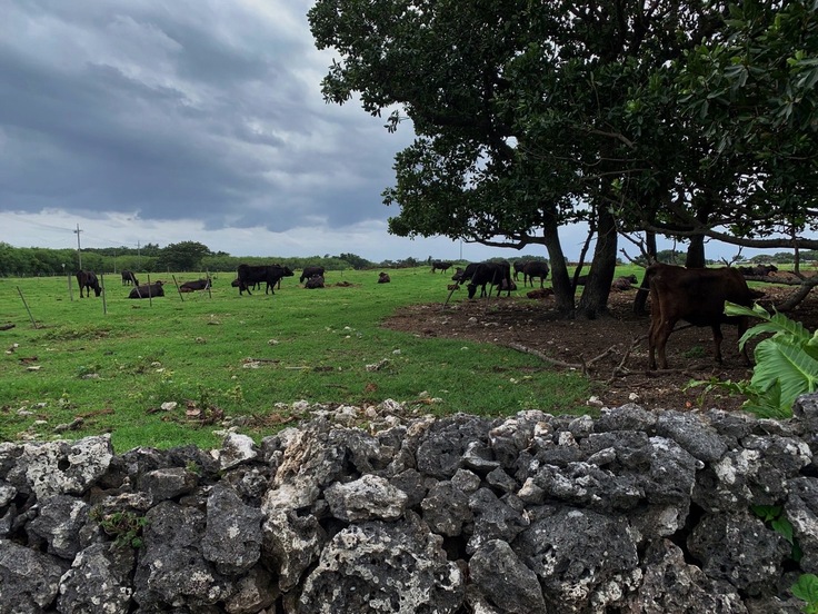沖縄県の石垣島から高速船で約30分のところにある黒島(通称「牛の島」)にて、私たち夫婦を中心に、両親、兄弟と共に牧場経営をしています。