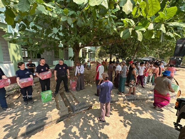 A-PADとGEA捜索救助チームは救助活動に加えて、訓練や心理ケアにも注力しました。4月3日にはミャンマー消防局向けに「地震とともに生きる」をテーマとした訓練セッションや、実践訓練を実施。さらに、GEA捜索救助チームは4月4日に避難キャンプの現場を訪れ、衛生キットなどの支援物資を配布しました。同時に子どもたち向けのゲームやアクティビティを企画し、震災経験による不安や恐怖の緩和にも取り組みました。
