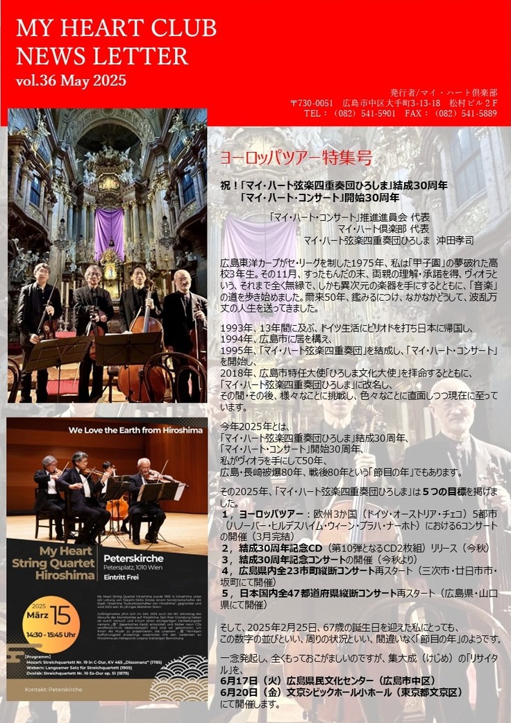 「マイ・ハート弦楽四重奏団ひろしま」結成30周年記念CDを鋭意、制作中です。