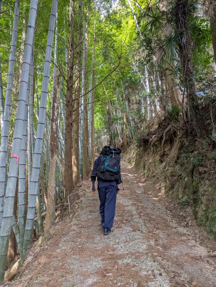 緑深い木々に覆われた急な坂道を一歩、また一歩と進むたびに、息が弾み、心臓の鼓動が体中に響き渡ります。しばらくすると、天高く伸びる竹林が目の前に現れ、風にそよぐ竹葉の音が、静寂な空間をやさしく包み込みました。その奥には、さらに険しい小道が続いていました。足元は不安定で、慎重に一歩ずつ進む必要がありました。