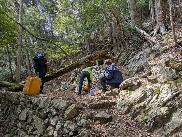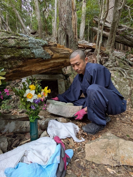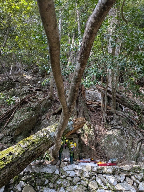 さらに山道を進むと、一人のご高齢の女性が私たちを温かく迎え入れてくださいました。八十八歳になられるその方の傍らには、共にこの地を守り続けてこられたお二人の姿がありました。この山奥の地には、もはや住む人もありませんが、それでもひっそりと祀られてきたお大師様の祠が、静かにそこに佇んでいました。倒木に押し倒され、危険な状態になっていた祠を前に、私たちは静かに手を合わせ、この地に宿る祈りの重みに深く心を打たれました。