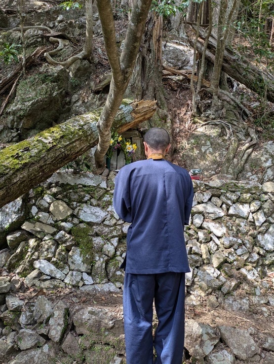 息を切らしながらようやくたどり着いた先には、神聖な空気が漂う、息をのむほど美しい山の光景が広がっていました。その荘厳さに、思わず立ち止まり、言葉を失いました。どこか、高山寺の裏山、明恵上人が修行に励んだ場所を彷彿とさせる、神々しい佇まいでした。同行していた副住職も、その光景に深く心を打たれ、静かに「まるで明恵上人の修行場のよう」と呟きました。その一言が、この場所の持つ特別な雰囲気を物語っているように思えました。