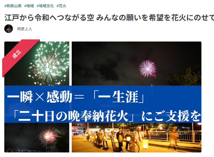 初めてのCFは、有田に息づく、江戸時代から続く奉納花火。その灯を守り抜きたい一心で、コロナ禍という未曽有の危機の中、初めての法蔵寺のクラウドファンディングに挑戦しました。不慣れな準備に戸惑いながらも、多くの方々の温かいご支援のおかげで、目標を達成できた時の感動と感謝は、今も鮮やかに心に残っています。https://readyfor.jp/projects/100667