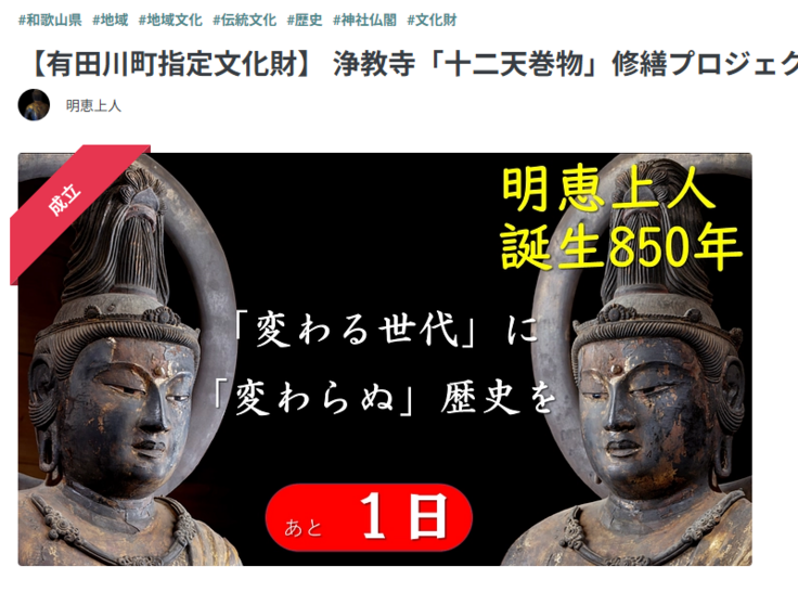 続く二度目の挑戦は、浄教寺に大切に保管されている町指定の文化財「十二天巻物」の修復でした。今回は、皆様に喜んでいただけるようなリターンを考え、じっくりと準備期間を設けました。しかし、町の補助金との兼ね合いで開始時期がずれ込んだり、財団の補助金も思うように進まなかったりと、困難が続きました。そんな中、私たちの支えとなったのは、日頃よりお世話になっている浄教寺の檀家様からの温かいご支援でした。また、新たなご縁もいただき、現在ではかけがえのない存在となっています。皆様のお力添えなしには、巻物の修復は到底叶わなかったと思います。