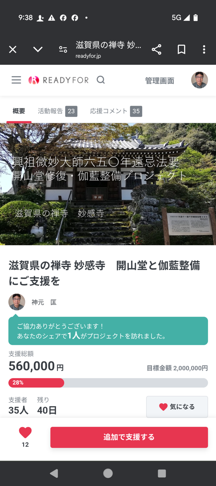 ご支援の額が目標額の1/4を超えました!
