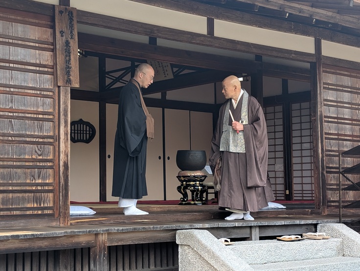 写真は、山川宗玄老師をご案内する妙感寺住職です。管長猊下はとても好奇心の高い御方で、寺宝などを長い時間をかけてご高覧頂きました。
