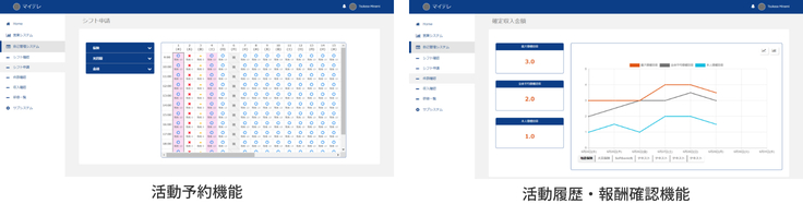 シフト入力、活動履歴や報酬確認など、直感的に操作できてカンタンです。また、そのまま動画で新しいお仕事の研修を受講できるなど、さまざまな機能が充実!