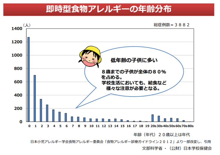 また、即時型食物アレルギーは低年齢の子どもに多く、8歳までの子どもが全体の80%を占めます。