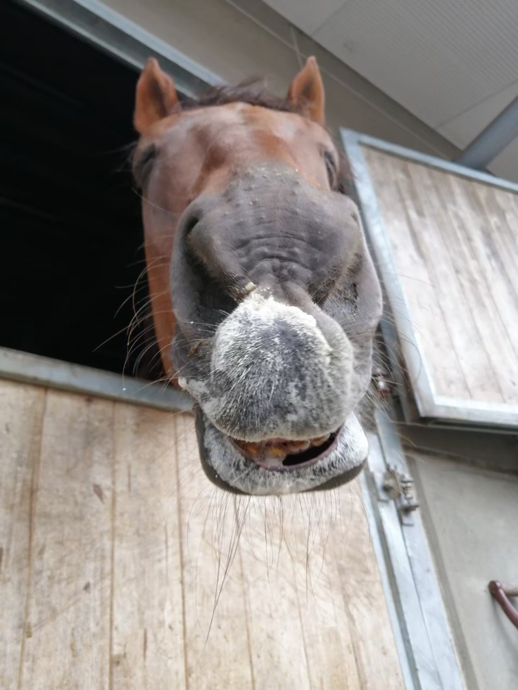 おやつを片手に「アンビ!」と呼ぶとすぐに馬房から顔を出し、撫でても嫌がらずおやつをじっとよだれを垂らしながら見つめます。(普段は呼んでも知らん顔)