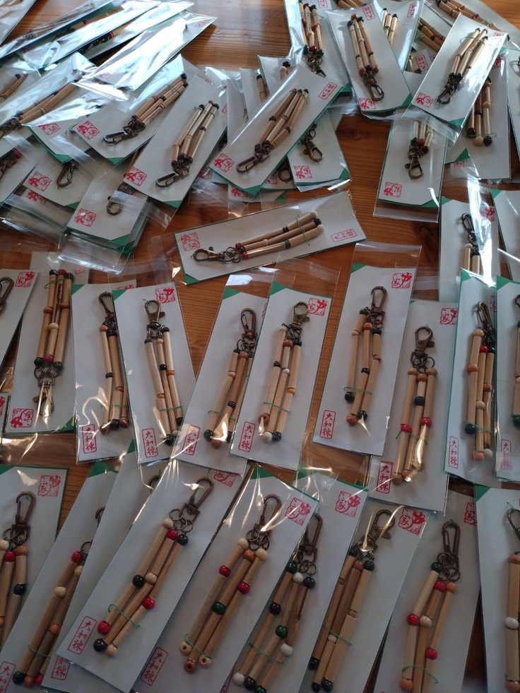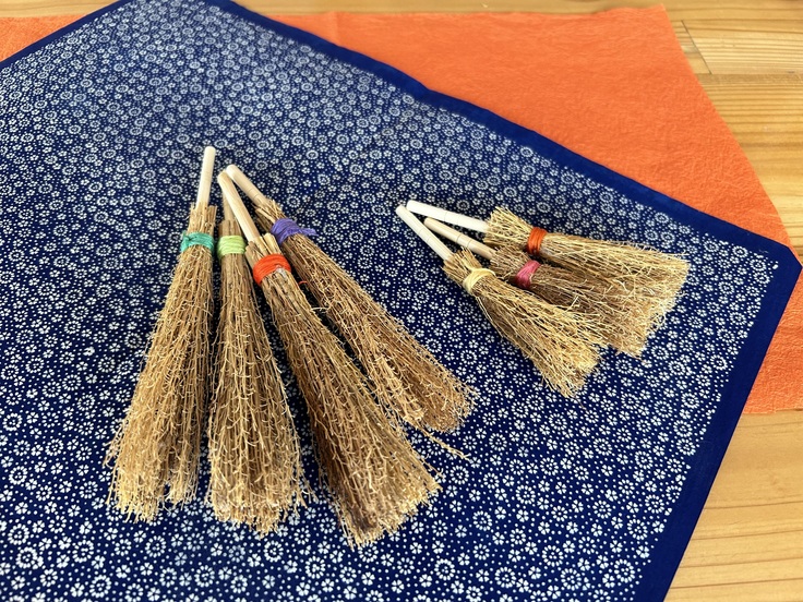 今回のご支援に対しての返礼品として、茅を使ったキーホルダー、ミニ箒、写真立てを川口さんと山﨑さんが手作りして下さっています。全て手作りのため、さまざまなサイズのものがあります。