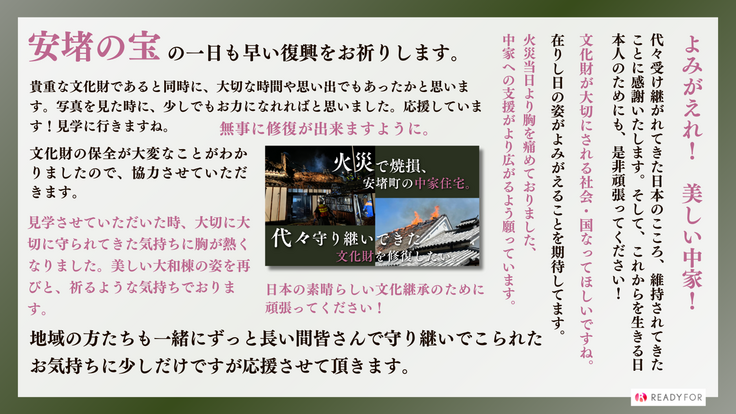 最初は大変不安でしたが、思ってもみないたくさんのご支援をいただき、お見舞いや温かい応援のお言葉を頂戴し勇気づけられています。誠にありがとうございます。