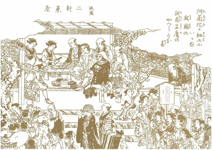 八坂神社の門前茶屋として発祥以来450余年、鳥居を挟むように2軒の茶屋が並び「二軒茶屋」と呼ばれ、京都のわらべ唱の新春手まり唱の歌詞の中にも名残りが残り、舞妓さんや芸妓さんが舞う「京の四季」でも歌われるくらい広く親しまれてきました。