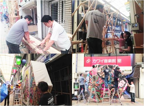 1990年頃、私たちの商店街の理事一行が町おこしを目的とした視察を行い、福島県長沼町のねぶた祭りを見て、町の一体感や盛り上がりに感動。中延商店街でも出来ないか思い、ねぶたを借りて行なったのが始まりです。その後、ねぶたを自ら製作して実施しようということになり、人形のねぶたを作ったりして第2回・第3回と重ねていました。ねぶた製作を行うのは、商店主をメインとした有志なので、どうしても夜に集まっての作業となっています。ねぶたを製作していると、佐藤洵一氏(青森県黒石市出身)と知り合い、ねぶたを手伝ってもらえることとなりました。