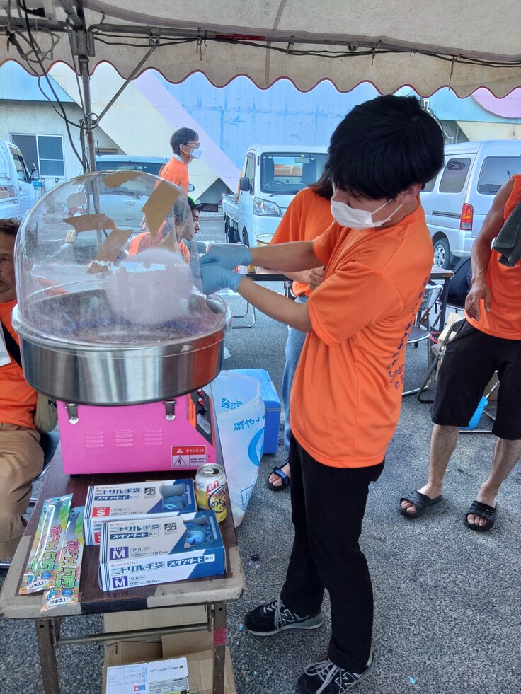 各地区焼きそばや唐揚げ、スーパーボールすくい、くじ引きなどなど工夫を凝らしたお店を出す中、わが中山地区は綿菓子のお店を出しました。