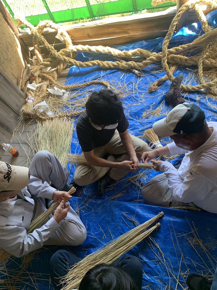 ただ、例大祭は毎年行いますので、こちらの準備は着々と進んでいます。今日は自治会の役員が春日神社に集まって、毎年恒例のしめ縄作りが行われました。
