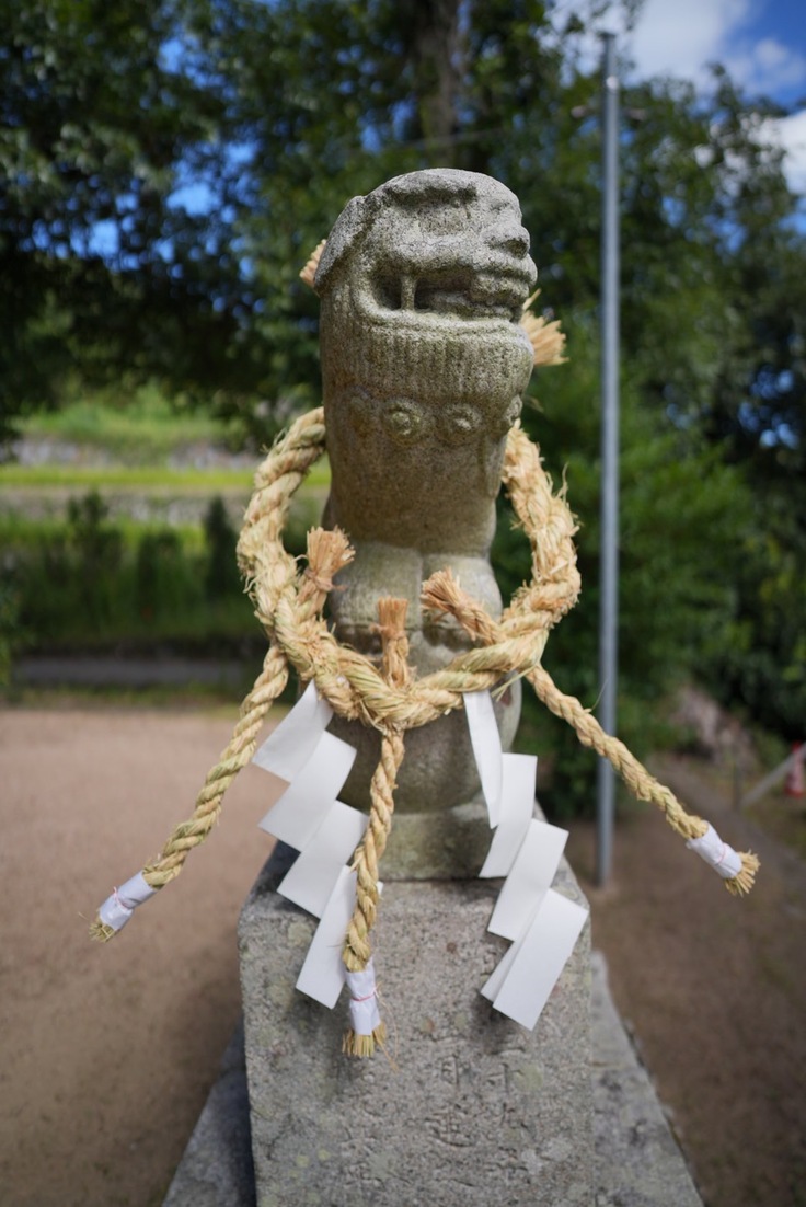 出来上がったしめ縄を狛犬に。