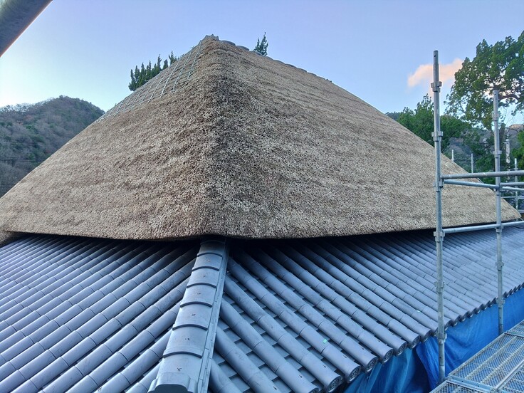 昨日、茅葺屋根の工事が終了したと聞いてさっそく見に行ってきました。上から下まできれいに刈り揃えられた茅。よく見ると上部三分の一と下部三分の二の勾配が違うように見えます。