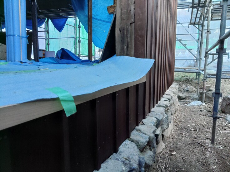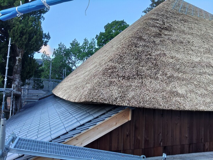 舞台西側(上手)から撮った写真。茅の端を直線的にするとか、丸味を帯びた形にするとか、建物のつくりとか、地域によって刈り揃え方が違うみたいですね。職人さんにどうしますか?と聞かれた時、私たちの中では直線的にカットした方が綺麗なのかなというイメージがあったんですが、職人さん曰く中山の舞台の形だとあまりエッジは効かせない方が綺麗だと思いますよ。との事なので、お任せしました。結果、職人さんの言う通り綺麗な形に仕上がりました。佐藤茅葺店の皆様、大変お世話になりました。