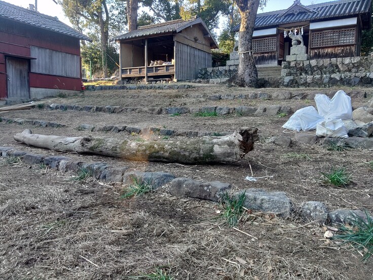 工事の機材や資材が置かれていた桟敷も、きれいに片づけられて、元の見慣れた姿に戻ってきました。そして、その桟敷の真ん中に置かれている丸太が、長年に渡って舞台を支えていたつっかい棒です。